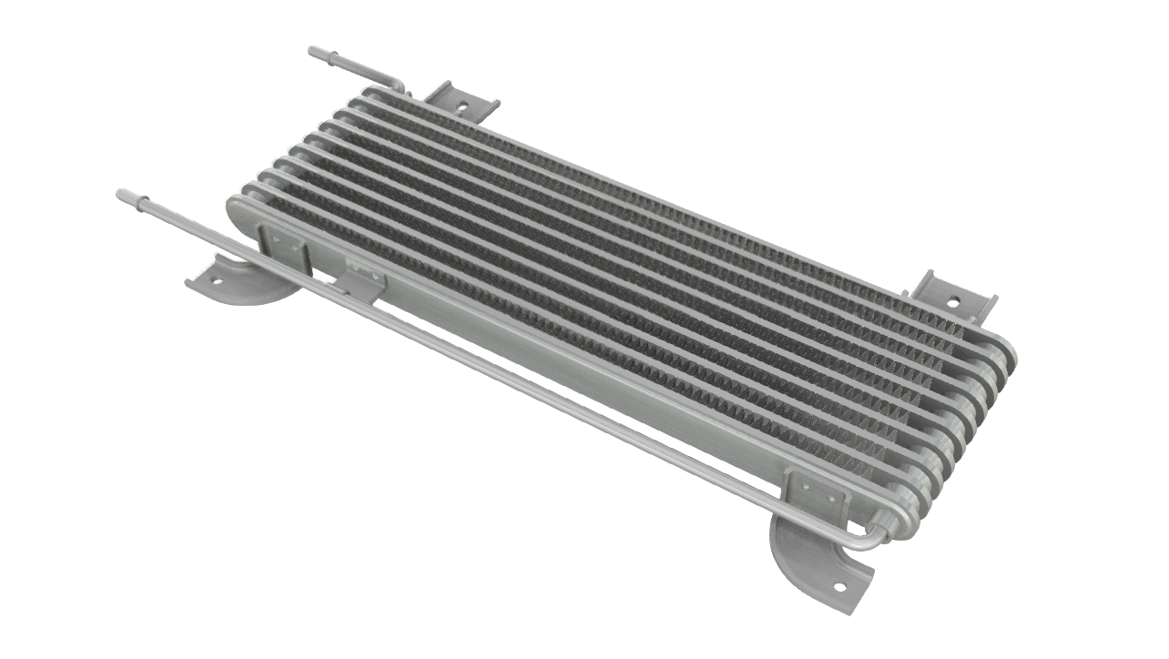 通過(guò)風(fēng)冷來(lái)制冷,受整車空間限制,通常安裝在進(jìn)氣柵格后面,主要用于對(duì)變速箱潤(rùn)滑系統(tǒng)的冷卻,降低由于油溫過(guò)高造成的變速箱性能降低甚至零件的損壞,同時(shí)也可應(yīng)用于對(duì)燃油的冷卻,減少由于燃油溫度過(guò)高造成的燃油損耗和汽車使用壽命的減少,該款產(chǎn)品支架與接管類型和焊接位置均可根據(jù)客戶需求進(jìn)行調(diào)節(jié),滿足不同裝配空間需求